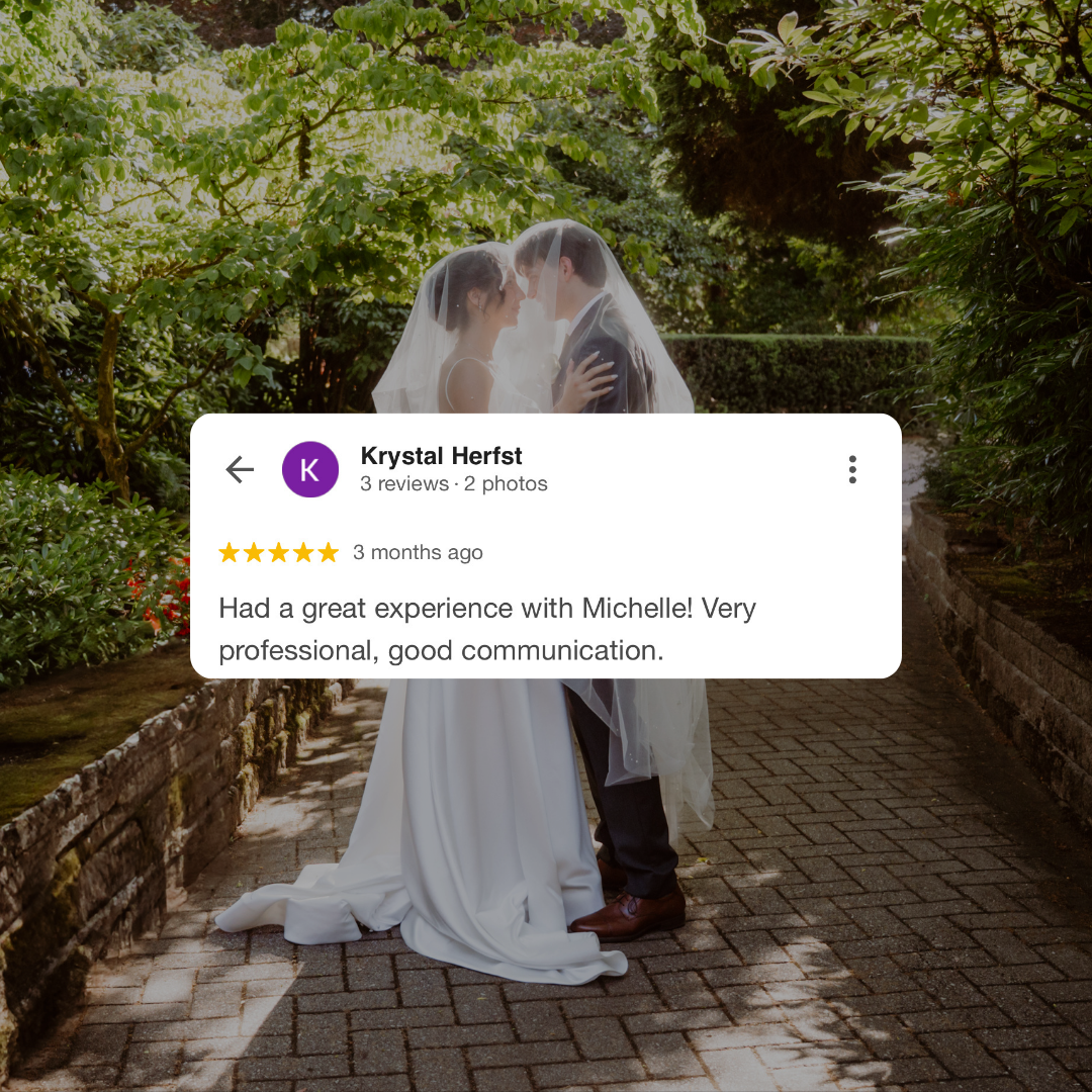 “We would like to give the biggest thank you to you Michelle! You are absolutely amazing at your job and an angel to work with. From booking and planning our engagement shoot, to going over our wedding timeline for the day to flow perfectly and for you to be able to capture everything I have ever wanted and more. You listened and gave the best advice, from looking at inspiration pictures, to now having the most stunning vintage wedding pictures EVERRRR!!!! You gave us everything and more. We look forward to working with you again Michelle, thank you!”